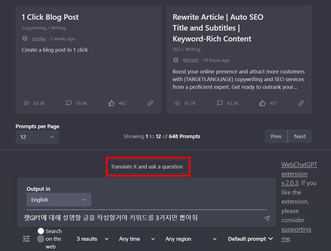 "Translate it and ask a question (번역해서 질문)"이라는 창이 생성되었습니다. 이제, 당당하게 한글로 chatGPT에 대해 설명하는 블로그를 작성할 테니 키워드를 3가지만 뽑아달라고 질문합니다. (아주 간단한 답변을 뽑아내기 위한 예시를 사용했습니다. )