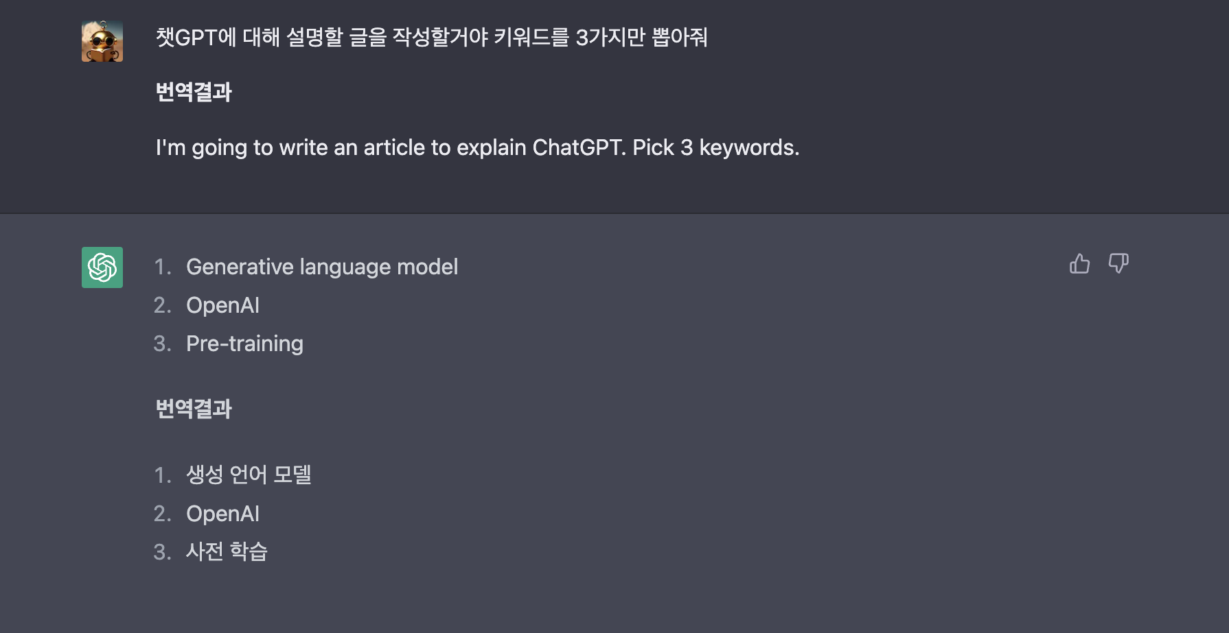 ChatGPT가 내어주는 결과 또한 한글로 즉시 번역을 해줍니다.