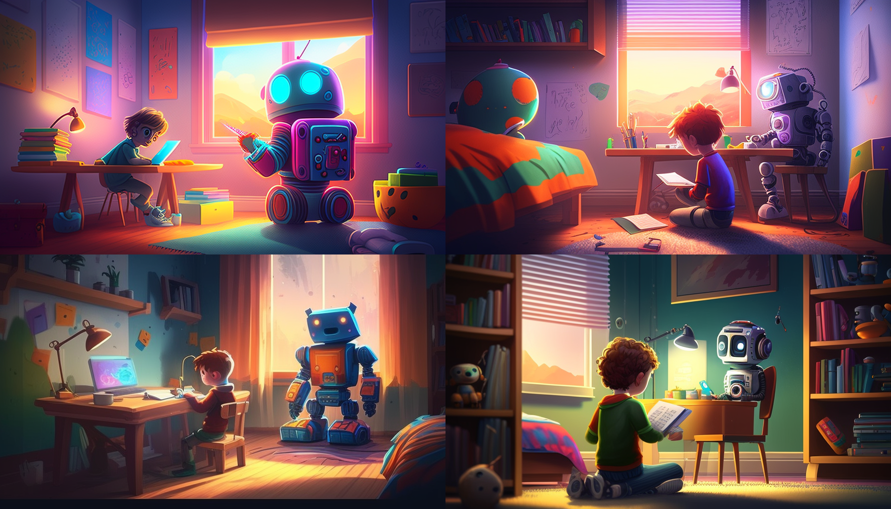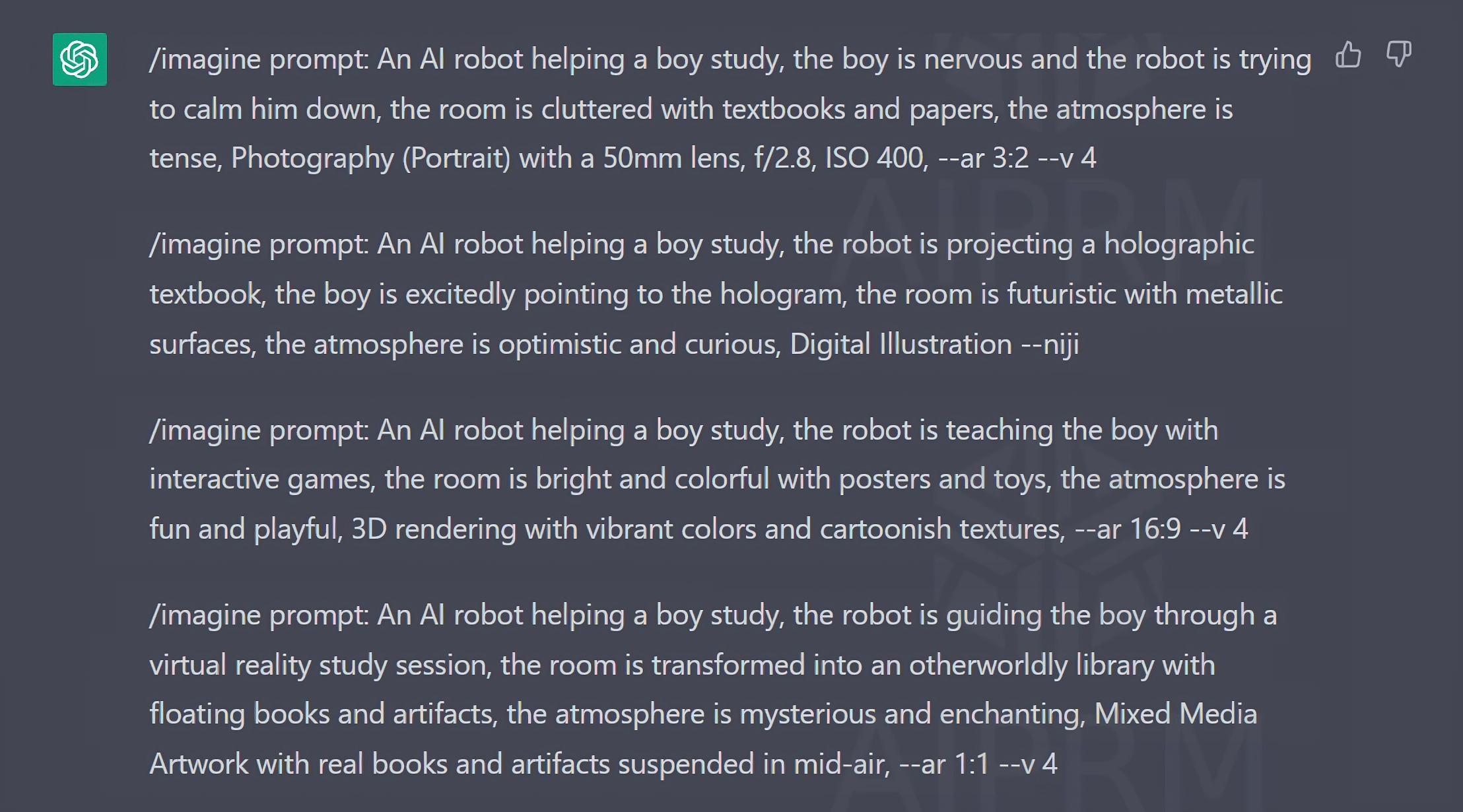 보이시나요? 그냥 "AI가 소년의 공부를 도와주는 모습" 이라는 질문만 했을 뿐인데 미드저니에 입력되는 형태로 프롬프트를 작성해줬습니다. 그것도 상세하게 말이죠. 저는 여러가지 시도해 보면서 미드저니의 그림들을 어떻게 뽑아낼 수 있는지여러 프롬프트들을 이걸 통해서도 알게 되었습니다. (추후 미드저니 사용법에 대해서도 포스팅을 해보도록 하겠습니다.)