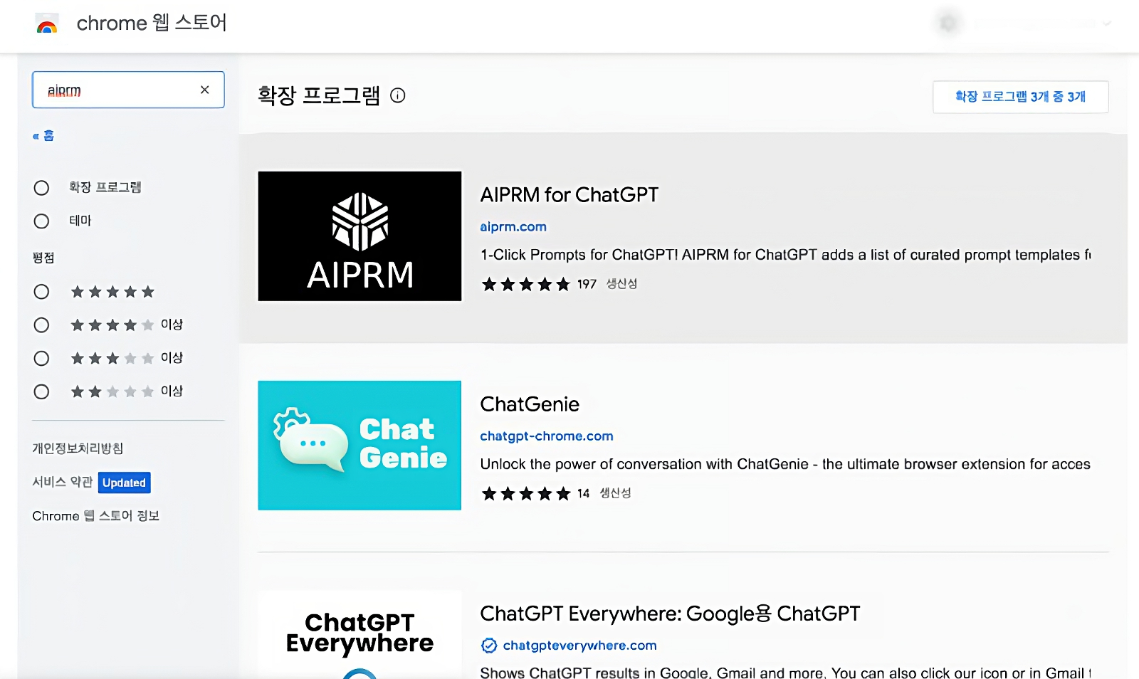 처음과 같이 구글 chrome 웹 스토어에서 AIPRM을 검색해주고 "AIPRM for ChatGPT"를 설치해 줍니다.