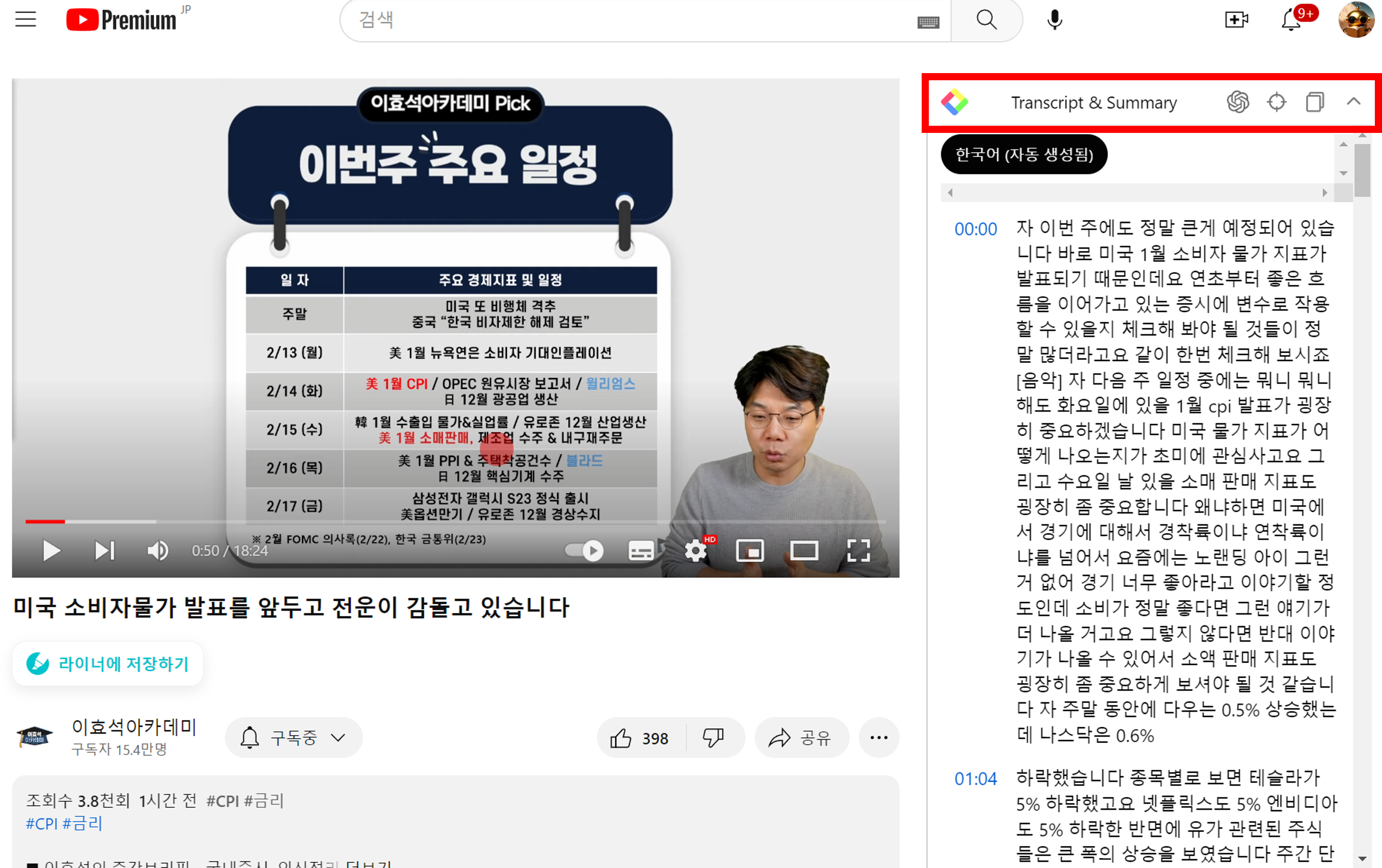 제가 좋아하는 이효석님의 영상을 틀어보도록 하겠습니다. 오른쪽 상단에 Transcript & Summary라는 새로운 메뉴가 생겼습니다. 클릭을 해보시면 Script가 한 번에 나오는 걸 보실 수 있습니다.