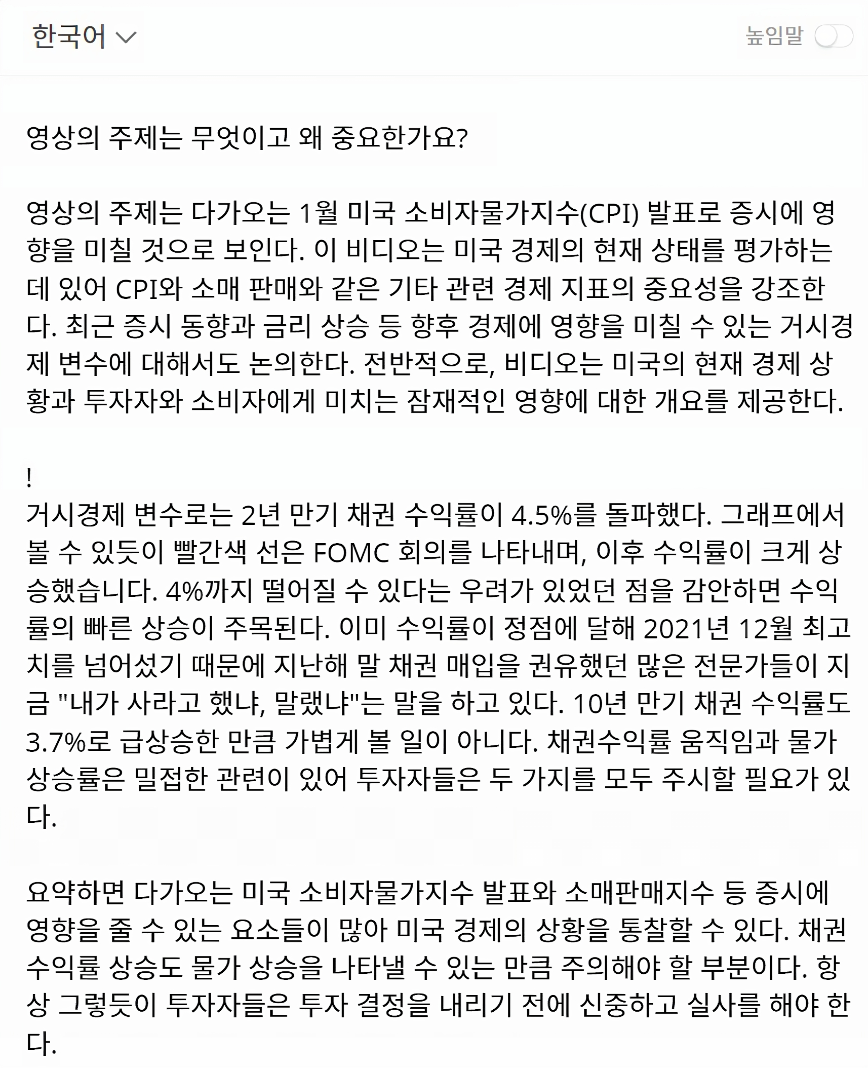 네, 다가올 1월 CPI 발표의 중요성을 이야기 하는 것 같군요. 좀 더 자세히 알려달라고 요청해 본 후 내용을 papago에서 다시 번역을 해봤습니다.