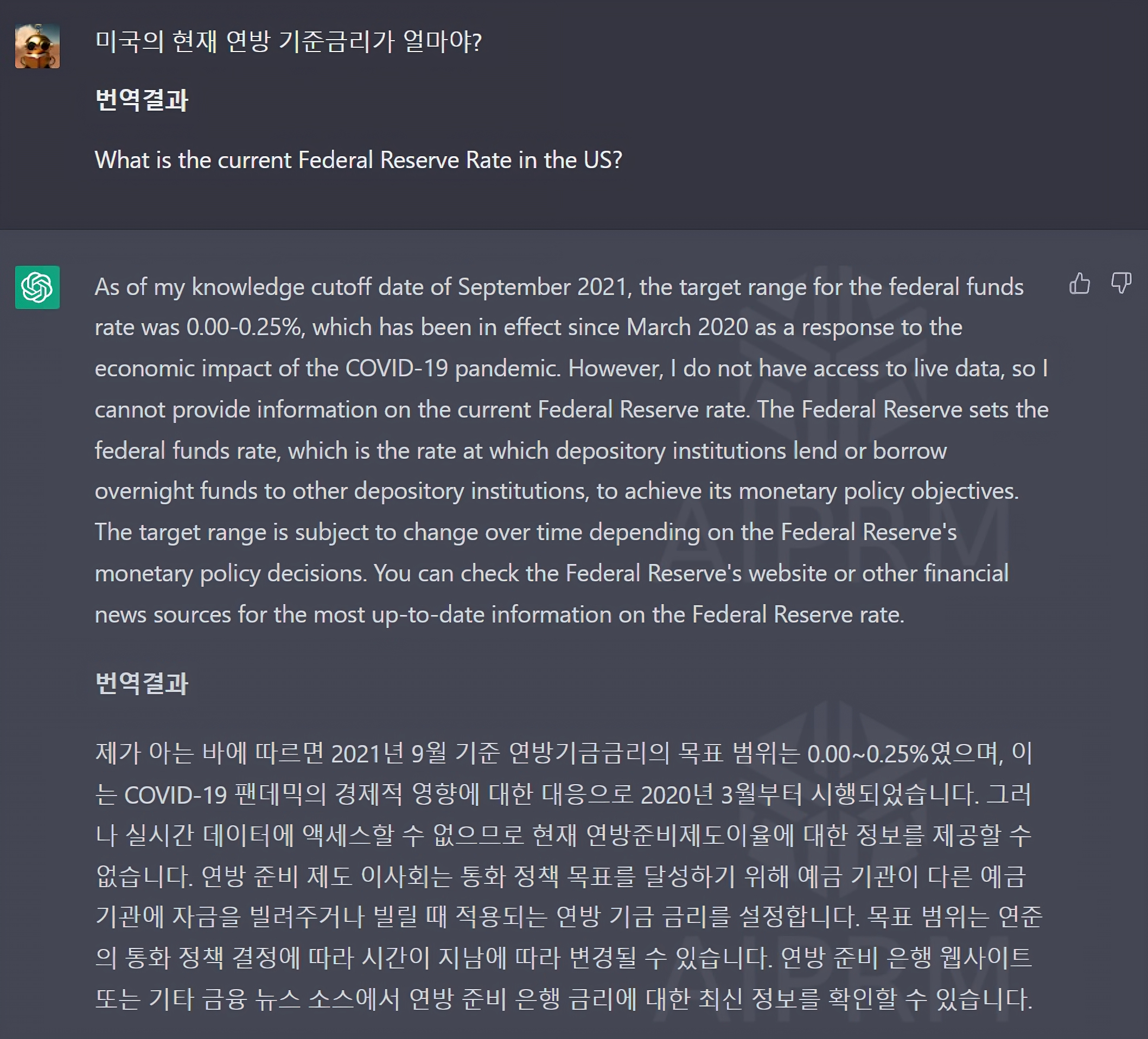 또한 현재의 ChatGPT는 2021년까지의 데이터를 기반으로 학습되었기 때문에 그 이후 최근의 일들에 대해서는 제대로 답변하지 못합니다.